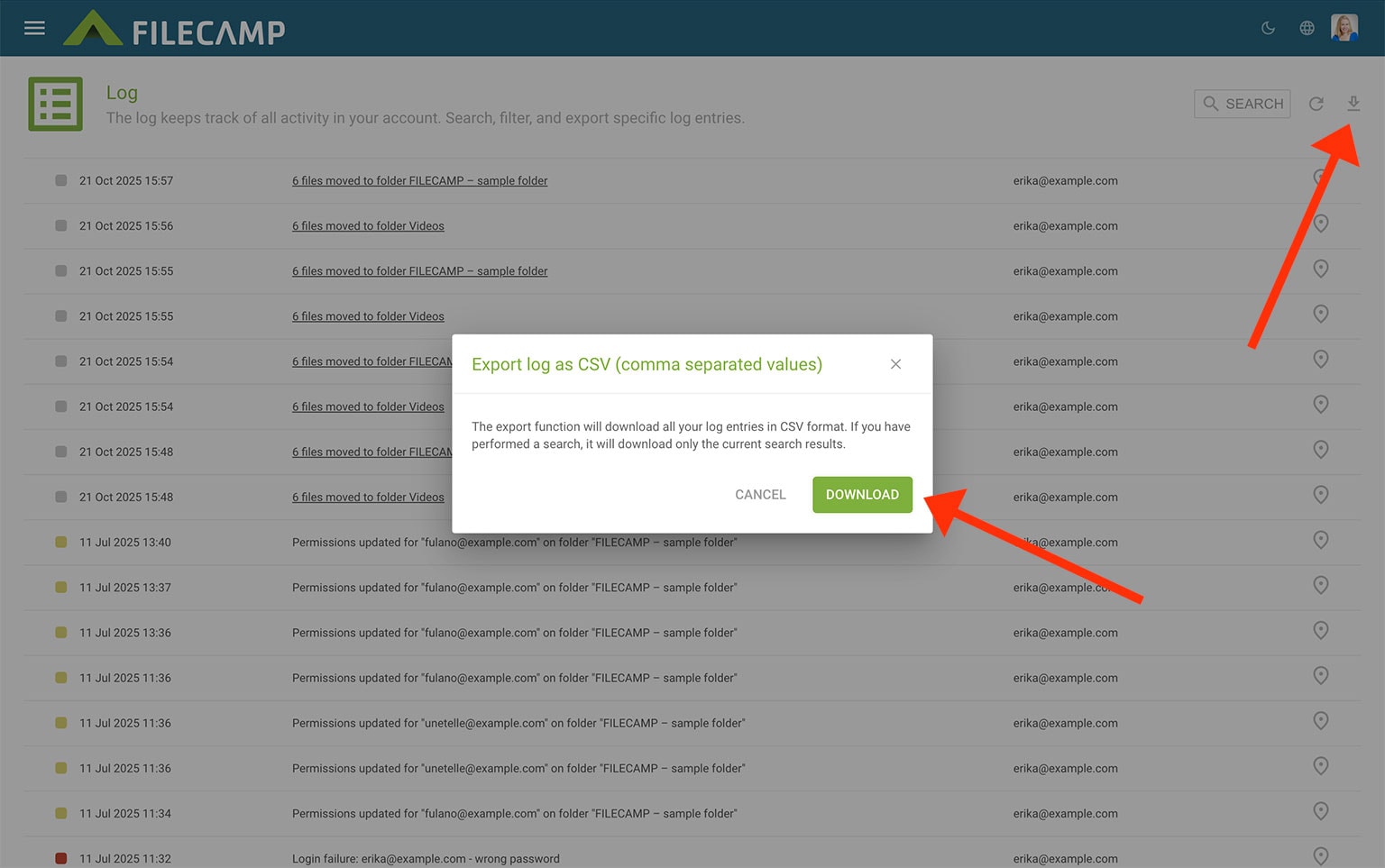 The log is a powerful tool that keeps track of everything that happens in your Filecamp account. You can view, filter, and export activity reports to help keep track of your Filecamp usage.